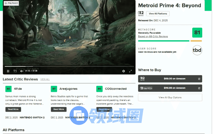 任天堂名作新篇《密特罗德究极4:穿越未知》即将于12月4日正式发售,日前M站评分公布,达到81分。