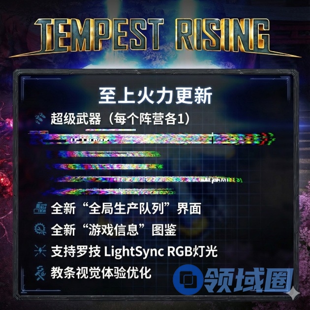 RTS游戏《风暴崛起》官方宣布,“至上火力(Superior Firepower)” 大型更新于今日(12月3日)正式上线。在遭遇战、自定义游戏与匹配模式中,使用全新“超级武器”对敌人发动毁灭性打击!全新的“全局生产队列”会将你所有正在建造的单位与建筑统一展示在一个便捷的队列中,并与建造菜单 UI 直接联动。你可以随时在队列中 取消、暂停或复制 任意正在生产的项目。官方还将加入全新的游戏内百科Codex。许多玩家都希望看到更详细的单位、建筑、支援能力等数据,而Codex能让你在游戏中几次点击即可查看所有关键信息。