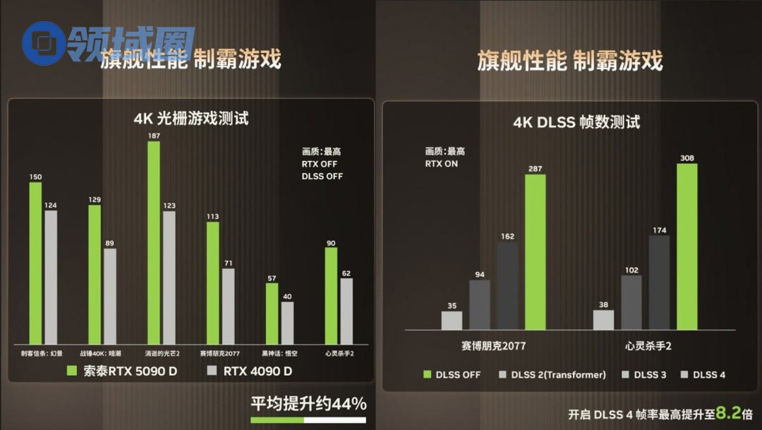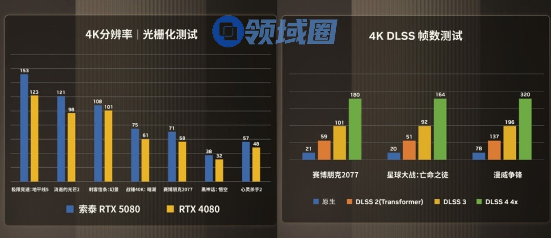 在4K分辨率的光栅游戏测试中,RTX 5080 提升幅度约23%左右,而在DLSS 开启之后,最高帧率比原生帧提升超8倍,实际游戏性能提升可见一斑,在4K分辨率下开启DLSS,能够高帧驾驭3A游戏大作。