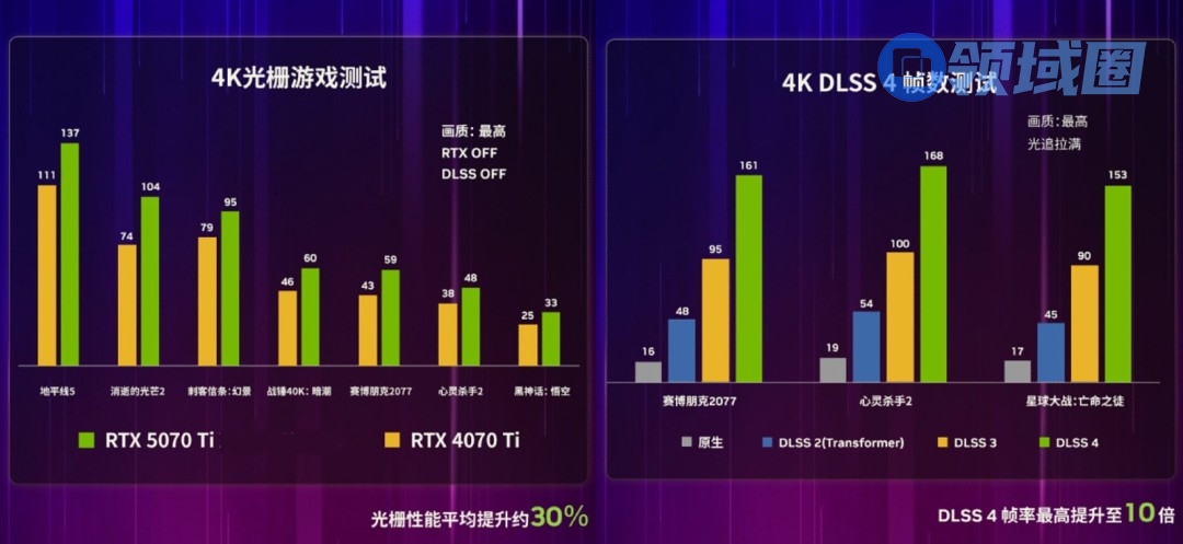 4K 光栅游戏测试,RTX 5070 Ti 几乎可以60帧以上畅玩,性能比RTX 4070Ti 整体提升30%,开启DLSS 4 之后,在4K分辨率下,帧数可以提升至150帧以上,这也是为什么RTX 4070 Ti 那么受4K游戏玩家欢迎的原因。