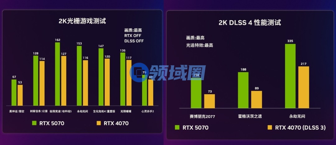 实际游戏测试中,2K分辨率,传统光栅游戏性能RTX 5070 比RTX 4070提升30%,而在DLSS 4的测试中,2K分辨率下,开启光追,RTX 5070 开启DLSS 4比开启了DLSS 3的RTX 4070性能提升高达2.1倍,赛博朋克2077 也能在158帧以上畅玩。
