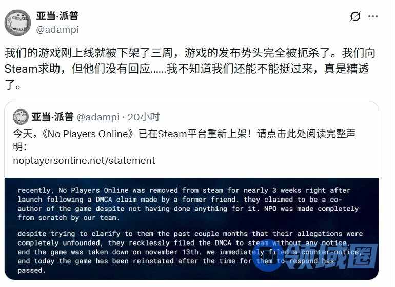 《无人在线》目前在(Steam/itch.io)平台销售中。制作人亚当·派普呼吁Steam版用户撰写评测,称这将有助于工作室。