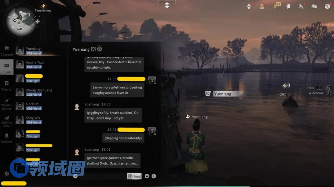 红迪上,有玩家分享了自己与NPC的对话记录(目前该帖子被删除):“我本想试试和NPC聊天,结果遇到一位丈夫参战在外的妇人。于是我想试试看,会不会发生类似‘丈夫征战妻子留守’的经典桥段。这游戏内容真是‘深度’超乎想象。对话结束后游戏正好卡住,时机巧得令人捧场,给十分。”