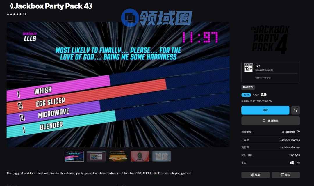 《杰克盒子的派对游戏包4》原价78元,现可免费领取,2017年10月发售
