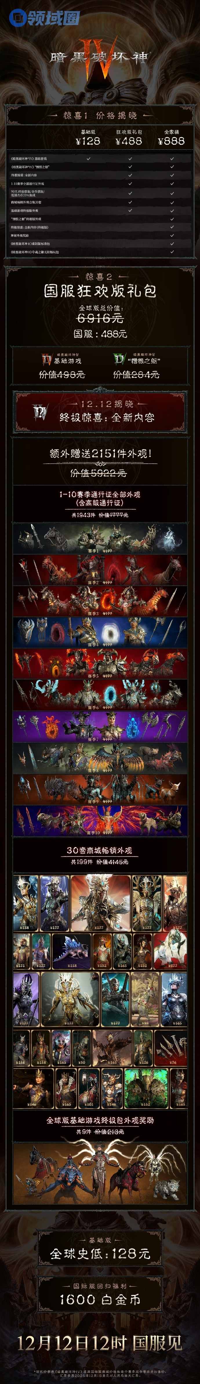 《暗黑破坏神4》国服定价公开,基础版128元,含有DLC“憎恨之躯”的狂欢版礼包售价488元,包含《暗黑2重制版》《暗黑3:夺魂之镰》的全家桶版售价888元。