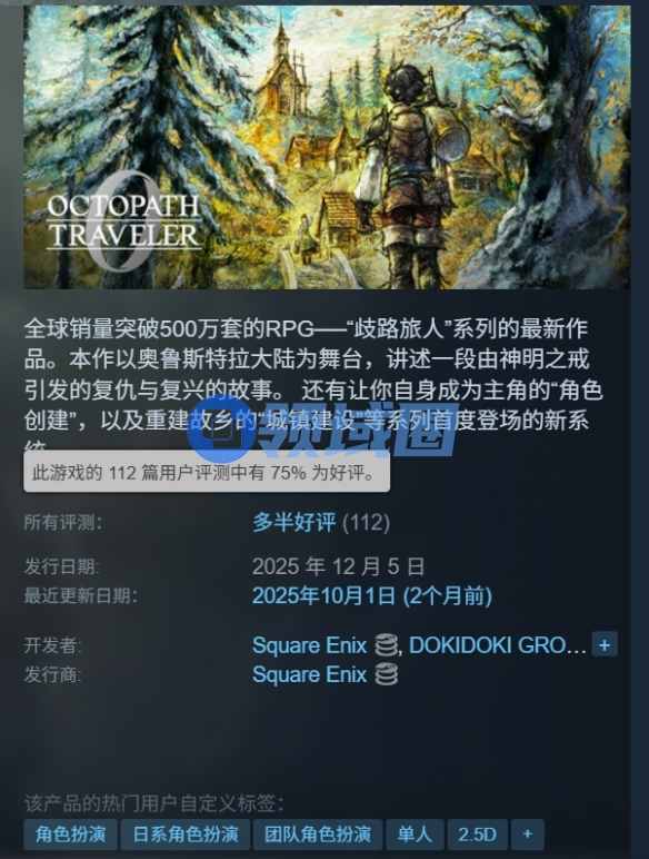 Square Enix旗下的角色扮演游戏《八方旅人0》现已正式发售,登陆PS4、PS5、Xbox Series X|S、Switch、Switch2和PC平台。截至截稿时,本作在Steam平台的评价为“多半好评”,好评率为75%。
