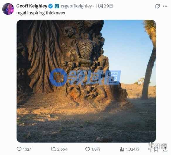11月29日,TGA创始人Geoff Keighley在社交媒体上发布了一张造型怪异的雕塑照片,并配文“regal.inspiring.thickness”。有玩家迅速识别出这段文字来自定位应用What3Words的三维定位词,对应坐标指向美国加利福尼亚州约书亚树国家公园附近的一处偏远地点。