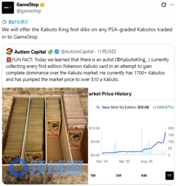 这股风潮愈演愈烈,甚至吸引了大型渠道和收藏平台参与互动。专注于游戏与卡牌收购的平台GameStop主动向Kabuto King提供PSA鉴定版卡牌的“优先购买权”;海外卡牌收藏应用Collectr官方更是提议:“等你集齐后,我们为你制作专属徽章和横幅!”