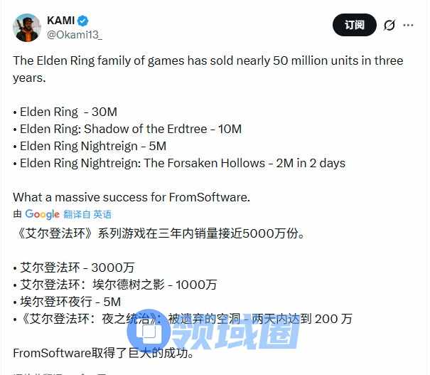另一方面,《艾尔登法环》本体目前销量已超过3000万。加上DLC“黄金树之影”1000万的销量,该系列在短短三年多时间里销量就接近5000万套。