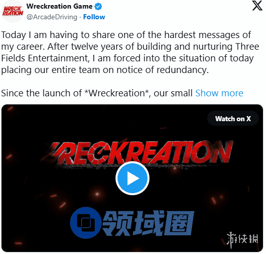 Three Fields Entertainment于2022年公布《破坏创造王》,这款主打自定义内容的开放世界竞速游戏于今年10月登陆PC、PlayStation和Xbox平台。工作室首席执行官菲奥娜·斯佩里在社交媒体发布的长文中痛心表示:"这对我们所有人来说都是心碎的时刻",但希望通过公开表态能"让有识之士看到这款游戏的潜力"。
