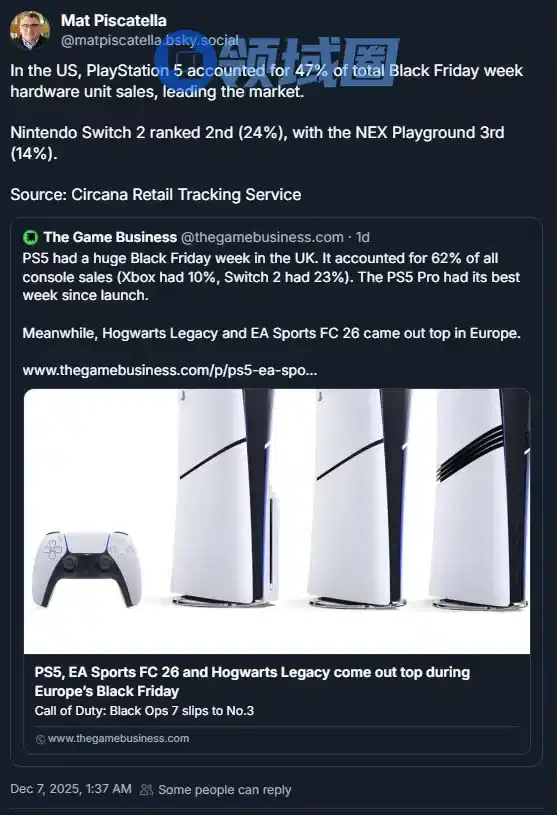 在美国市场,知名行业分析师马特·皮斯卡特拉指出,PS5占据了黑五当周主机总销量的47%以上。任天堂Switch 2以24%的份额位列第二。Xbox系列未进入前三,该位置由占据14%销量的NEX Playground取得。