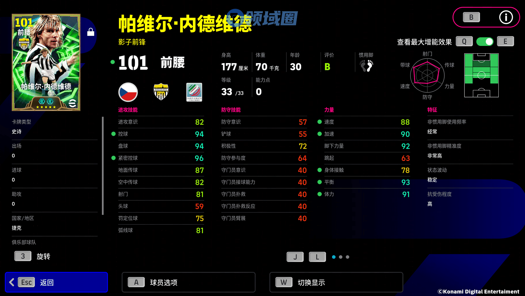 自带【无定型射门】特殊技巧的内德维德有着不俗的射门能力,以及优异的逆足能力,持球推进后能用逆足发炮,直窜球门死角!