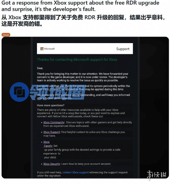 在获得的客服回信中,Xbox方面确认,已将该问题上报给开发团队,目前正在审查处理中。信中写道:“开发团队正在积极努力,以尽快解决此问题。” 客服还特别请求玩家,在接下来的 24至72小时内 定期检查游戏及相关选项,因为修复或更新可能会在此期间推出。