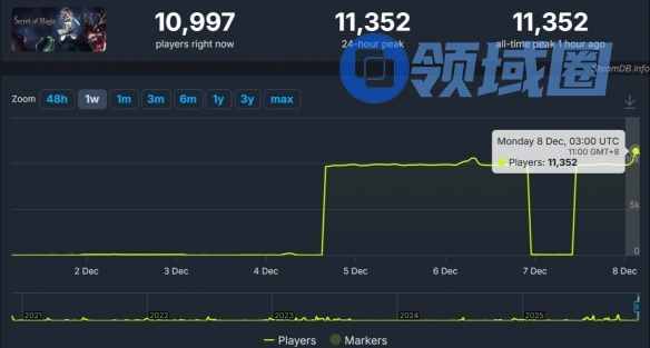 长期以来游戏线上人数极低,但在 12 月 5 日凌晨 12 点 50 分左右,玩家数量从 12 人直接飙升至 9,657 人,接下来 24 小时内几乎停在「一万人不到」的位置,波动极小。