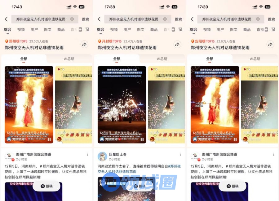 从12月4日-6日,玩家可以在郑州记忆·油化厂创意园体验“油炸集市+非遗体验”的跨界狂欢,既能吃到炸八块、赛熊掌、红烧黄河大鲤鱼等地道豫菜,还有游戏里“雷神”、“火麒麟”造型的“军火烧饼”免费领。现场有河南非遗打铁花表演,火枪、火刀、火雷交织绽放,非常震撼,还能和AI金刀锋合影,参与4V4宿舍车对战等互动游戏,还举行了场面宏大的无人机表演,让CF手游成为了园区最靓丽的风景线。而现代无人机与非遗打铁花的跨时代组合表演,更是成为了万众瞩目的焦点,话题 #郑州夜空无人机对话非遗铁花雨 一度登上郑州、开封、洛阳等14座城市的同城热搜榜。