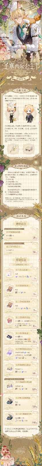 12月6日09:30 - 12月20日05:00,全新活动[圣塞西尔公主节II]上篇开启,参与活动可获得[钻石]*300、[老荷兰颜料]*5、[侍应生校园换装I]*2、江叙白免费R卡[花舞时分]、专属头像框[公主盛典]、[情侣头像]*2、[觉悟]*1等奖励!