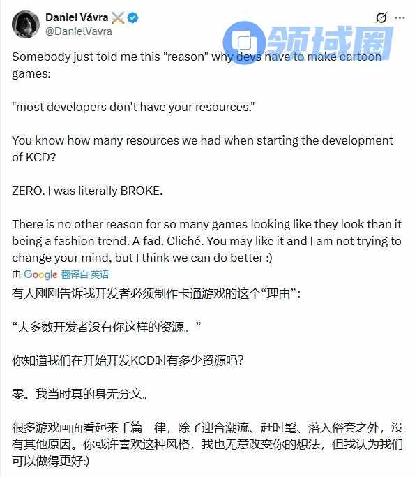 事情的起因是一则据称来自其他开发者的评论,该评论暗示制作写实游戏比创作风格化或卡通化项目需要“更多资源”。瓦夫拉对此完全不予认同,并回忆了项目起步时的艰难境地:“有人刚用这个‘理由’告诉我为什么开发者只能做卡通游戏:‘大多数开发者没有你那样的资源。’你们知道我们开始开发《天国:拯救》时有多少资源吗?零。我当时真的身无分文。”