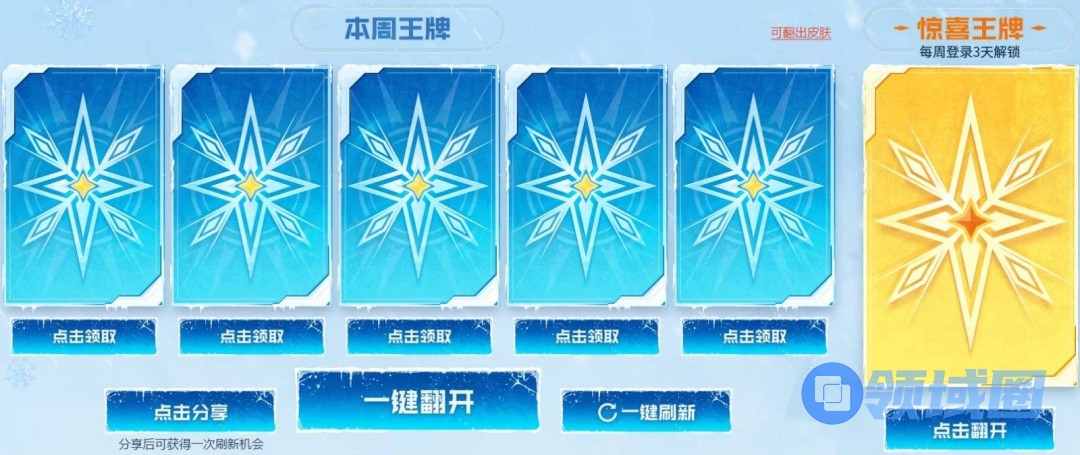 第一、二周可翻两张牌,第三周可翻三张牌,第四周可翻4张牌,第五周可翻5张牌,每周分享活动还可刷新一次已翻出道具(领取道具后将不可刷新)。