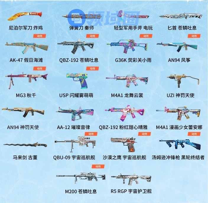 AK-47 假日海滩、QBZ-192 苍鳞吐息、G36K 荧彩关小雨等超多动效皮肤等你翻牌带回家。