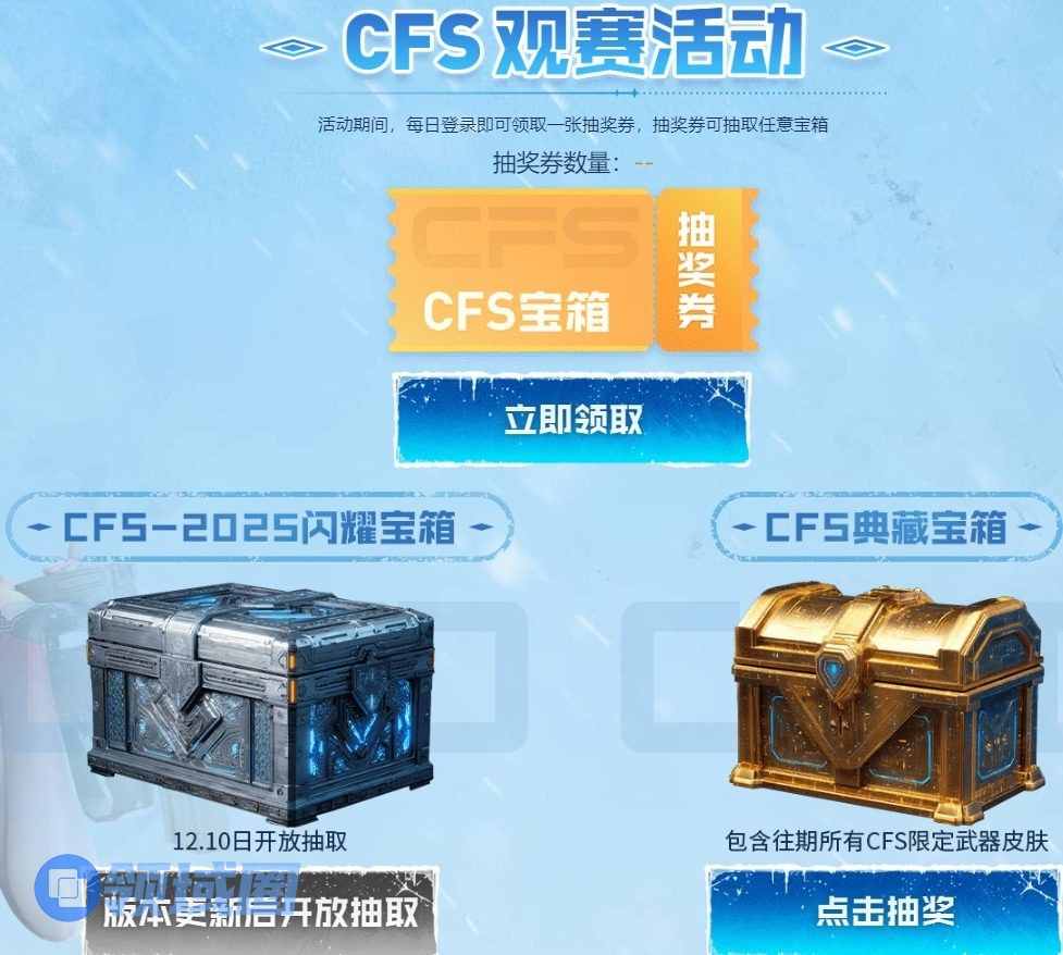 即日起至12月14日,CFer每日登录游戏即可领取1张抽奖券,可开启CFS-2025闪耀宝箱以及CFS典藏宝箱。