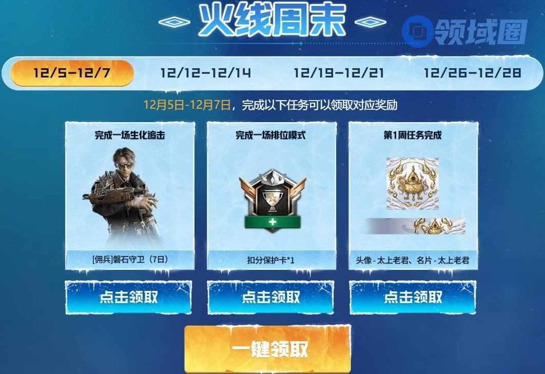 12月还将开启火线周末活动,CFer周末完成任务即可领取对应道具奖励。