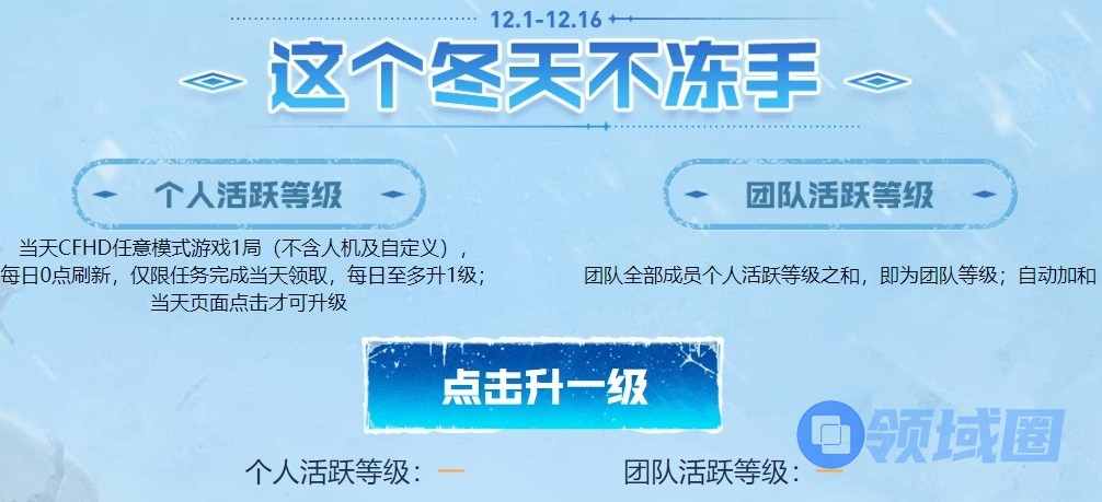 12月1日-16日还可参与“这个冬天不冻手”组团活动,每日完成CFHD游戏对局提升个人及团队活跃等级。