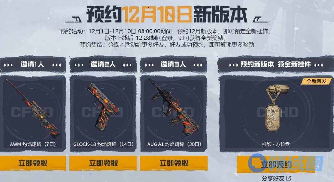 12月10日8:00前预约12月新版本即可领取全新挂饰-方位盘,分享活动还能解锁灼焰熔眸系列道具。