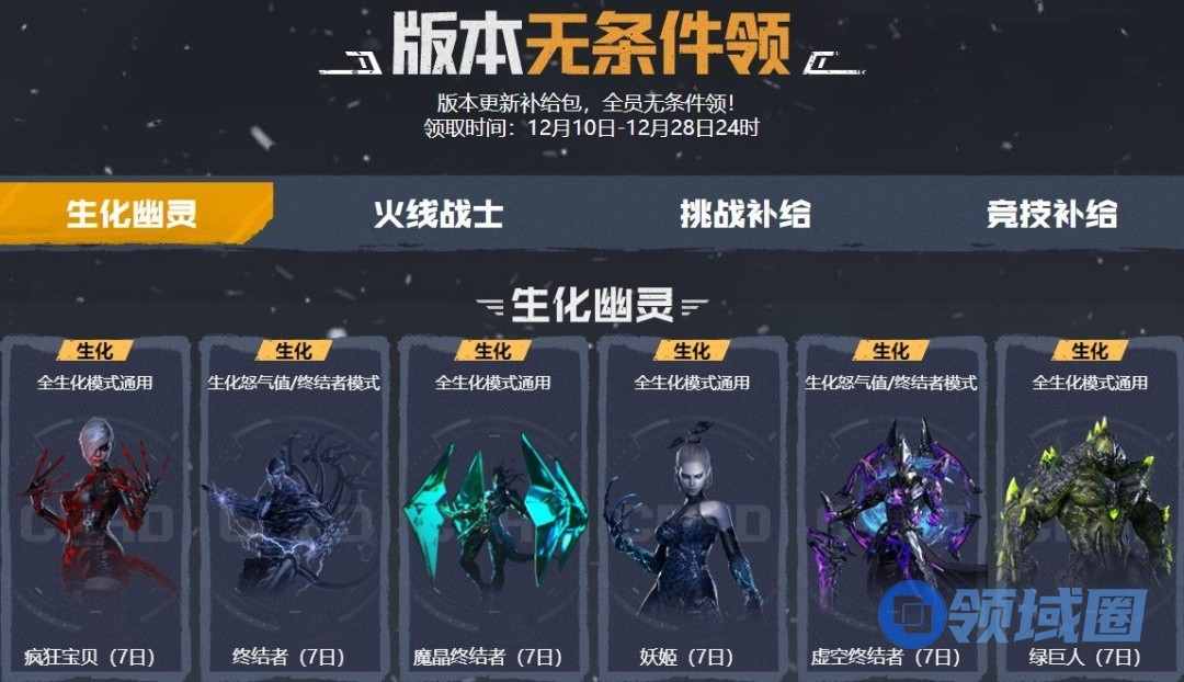 更新后至12月28日24时,还可领取版本更新补给包,生化幽灵、火线战士、挑战补给、竞技补给四重礼包全员无条件领!