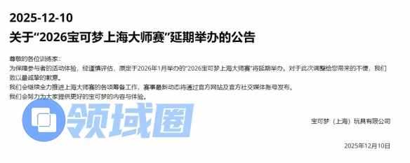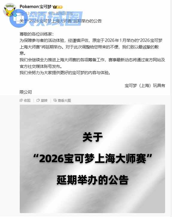 “2026宝可梦上海大师赛”已宣布延期。赛事原定于2026年1月举办,但为保障参与者的活动体验,经官方谨慎评估后决定延期。