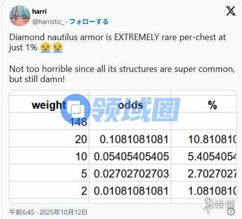 此次更新终于允许玩家驯服并装备在水下的新宠鹦鹉螺,为了保护这个脆弱的小家伙,官方贴心地设计了五种材质的“鹦鹉螺铠甲”。其中最顶级的“下界合金鹦鹉螺铠甲”获取流程极为繁琐,玩家需要先获得“钻石鹦鹉螺铠甲”,再配合锻造模板和下界合金锭进行升级。真正的噩梦在于那个前置的钻石甲——它只能通过海洋沉船、海底神殿或埋藏的宝藏箱子开出。据民间数据大神实测,其掉落率仅约为惊人的1.1%。不少玩家跑遍了半个服务器的海洋群系,连个铁甲的影子都没见着,更别提钻石版了,这让许多以全收集为目标的强迫症玩家直呼汗流浃背。