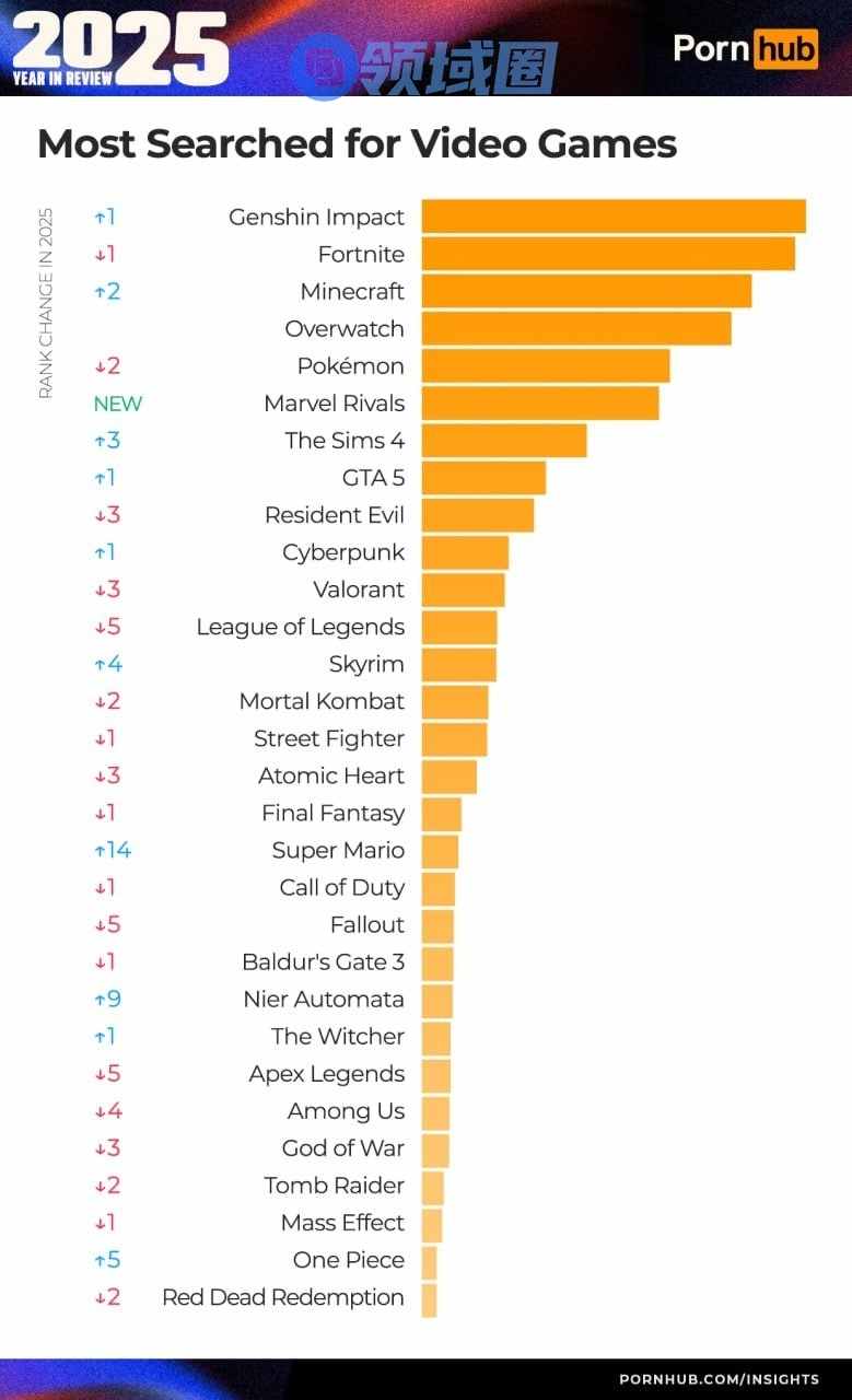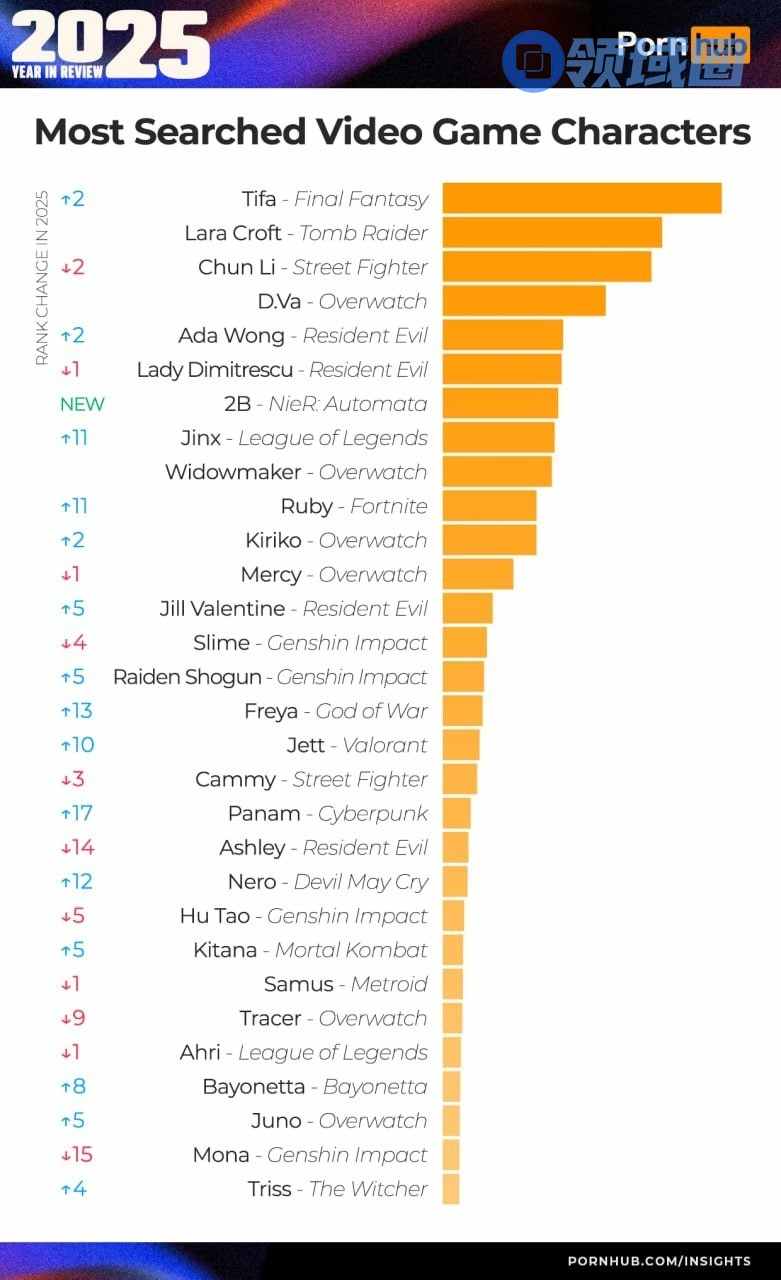 近日国外娱乐网站PornHub公布了2025年热搜游戏角色榜单,热搜游戏榜单等。一起来看看哪位游戏女角最受欢迎。令人意外的是,《剑星》女主伊芙竟然没挤进前十。