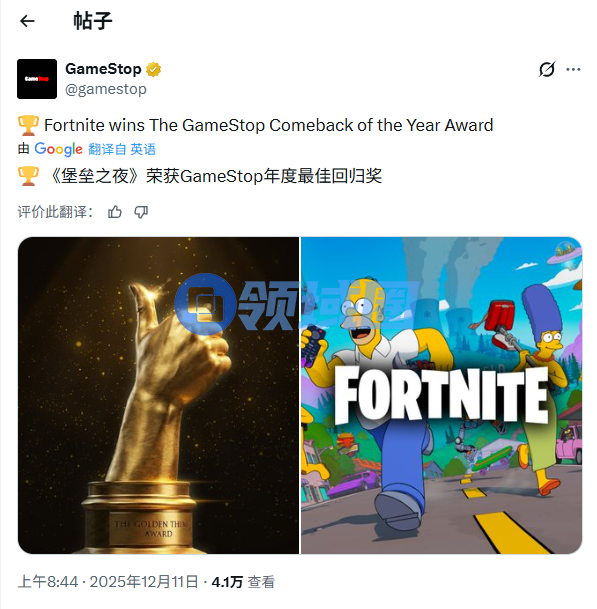 年度回归奖:《堡垒之夜》