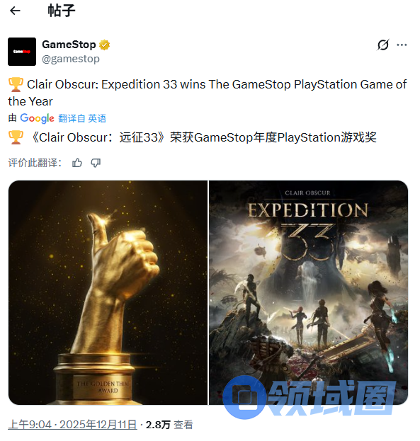 年度PlayStation游戏奖:《光与影:33号远征队》