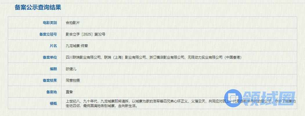 近日,国家电影局发布关于2025年11月上全国电影剧本(梗概)备案、立项公示的通知,电影《九龙城寨·终章》备案立项,由欧健儿编剧。