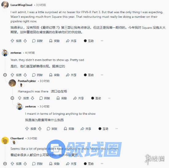这一“静默”令许多玩家感到错愕与失望。在Reddit等社区,相关讨论迅速涌现。玩家直白地表达着情绪:“说实话,太让人失望了”,“他们甚至懒得出现,真可悲。”这背后,是玩家对SE旗下《最终幻想》、《勇者斗恶龙》等顶级IP新动态的期待落空。