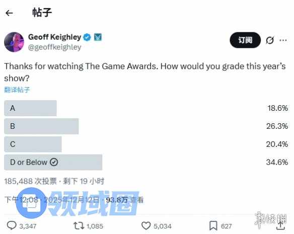 TGA顺利收官之后,主持人杰夫·基思利在社交平台X上发起互动,向广大玩家征集对本次TGA的看法。截至当下,已有超过18万玩家参与投票。从投票结果来看,选择“A”选项的玩家仅占比18.6%,而选择“D”选项的玩家比例超过了34.6%,由此可见,不少玩家对此次TGA的满意度似乎并不高。
