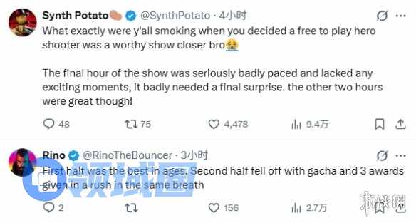 知名游戏博主Synth Potato和Rino也在评论区留言吐槽:“你们究竟是怎么想的,居然觉得一款免费游玩的英雄射击游戏能成为压轴项目啊,兄弟?整场典礼的最后一小时节奏完全乱套,根本没有任何能让人热血沸腾的高光时刻,真的迫切需要一个真正能让人惊喜的收尾。前面两个小时的环节倒是还挺精彩的!”