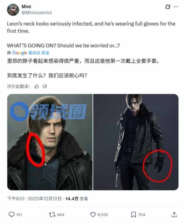 图中可以看到,里昂的颈部出现了明显的黑色疤痕,感染迹象十分严重,有玩家猜测认为这或许是他首次佩戴全套手套的原因。