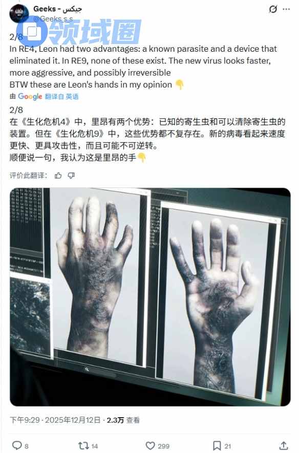 在今年的TGA2025颁奖典礼上,卡普空公布了《生化危机9》全新预告片,并正式确认里昂将在本作中登场。而预告片中,有玩家发现一个惊人的细节——里昂疑似感染了病毒。