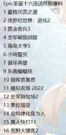 目前泄露的Epic圣诞15连送名单:数字为送出日期
