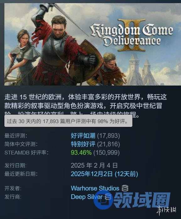 截至发稿前,《天国:拯救2》总评测为特别好评,21816位玩家打出了93%的好评率。而近期评价好评率更高,17839位玩家给出了98%的好评率,可谓口碑爆棚。