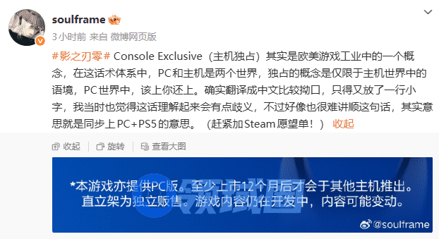 近日,为避免争议,《影之刃零》制作人梁其伟在微博发文对图中的“独占”进行了解释。梁其伟表示:“其实意思就是同步上PC+PS5的意思。”