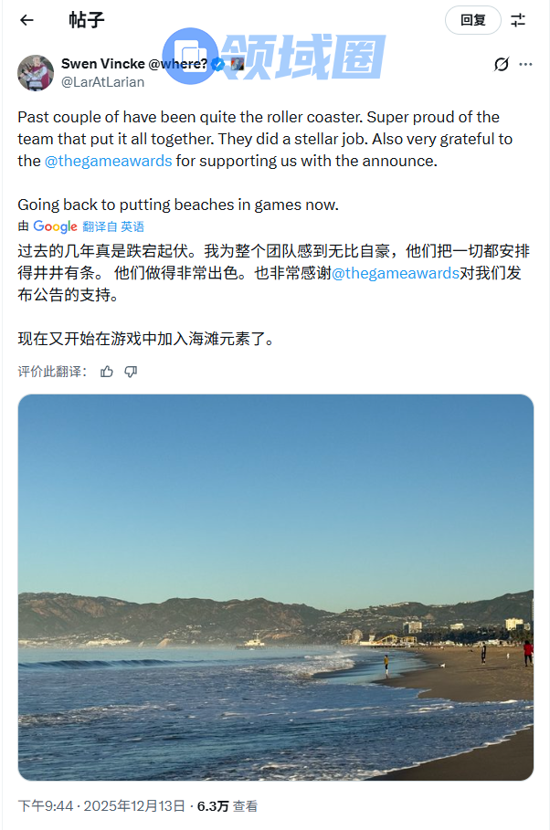 在TGA结束后的社交平台发文中,Vincke回顾了团队完成新作公布过程的经历,并对开发团队及TGA表示感谢。他随后补充称,将“回去继续在游戏里做海滩”。这一表述被部分玩家解读为新《神界》作品中可能包含海滩相关场景。