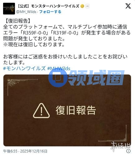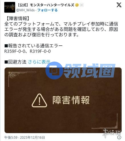 12月16日,随着卡普空正式推送《怪物猎人:荒野》第四弹免费大型更新,阔别多年的超大型古龙巨戟龙终于回归狩猎场。然而,许是猎人们想要挑战G级解禁怪的热情过于高涨,游戏在全平台范围内爆发了严重的联机事故,大量玩家在尝试加入多人任务时遭遇了代号为R359F-0-0与R319F-0-0的通信错误,只能望着屏幕上的报错弹窗叹气。