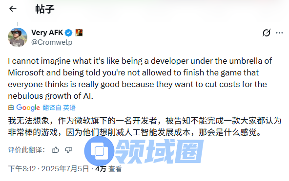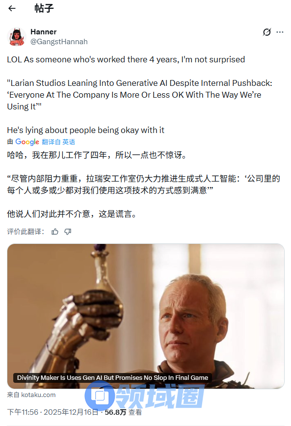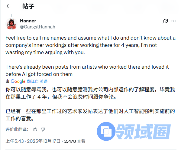 然而,这番解释并未说服所有人。曾在拉瑞安任职、网名为Hanner的前员工也加入了讨论。她此前在质量测试和制作岗位工作,指责文克歪曲了团队内部的真实态度。她声称,管理层在开发者并不情愿的情况下强行推行生成式AI,而“公司内部基本达成共识”的说法并不属实。在她看来,引入这类技术正在破坏拉瑞安作为优秀工作室的声誉,本质上只是压缩成本的手段,对提升制作效率并没有实际帮助。