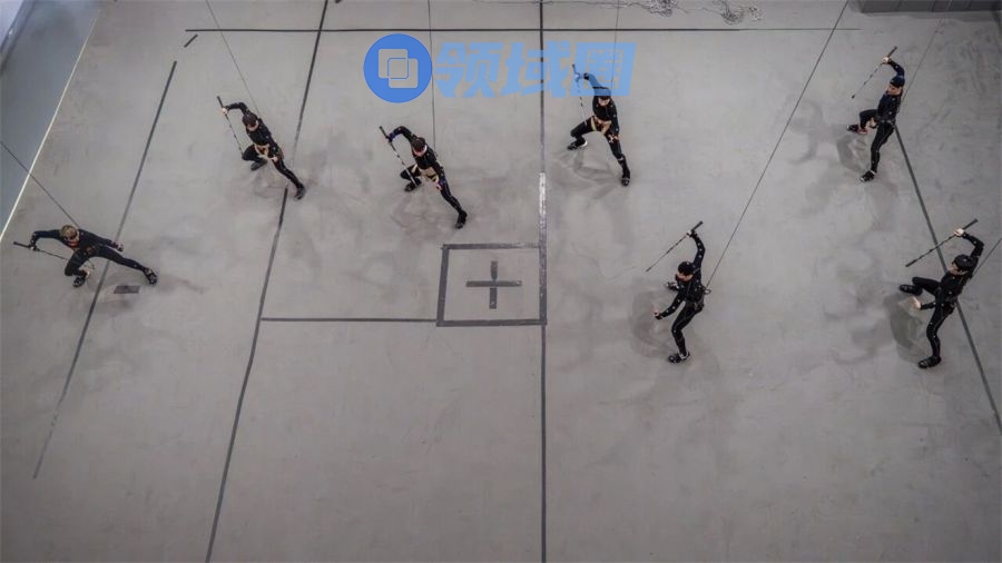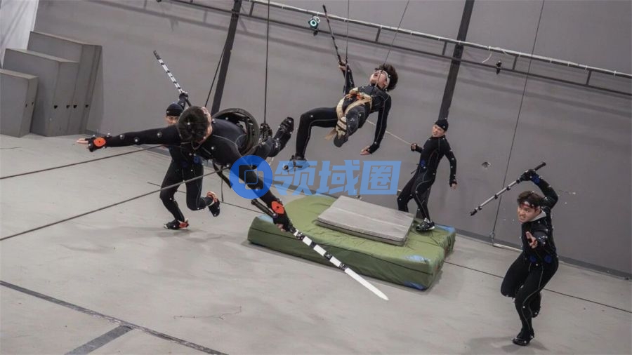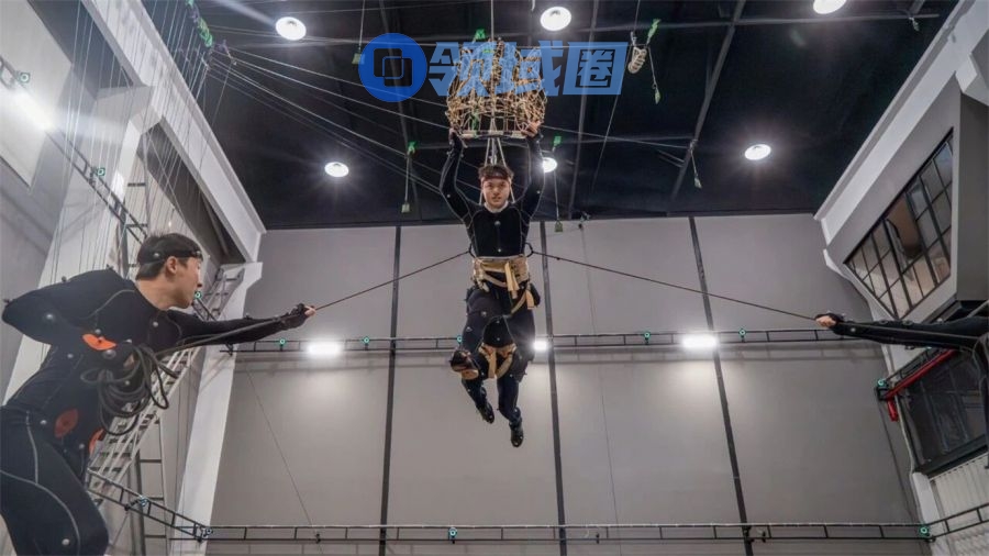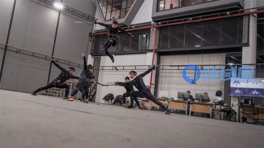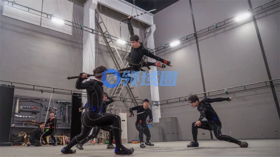 灵游坊位于上海的动作捕获工作室空间开阔并拥有挑高天花,便于吊威亚的演员完成腾跃、翻腾与飞踢等超常规动作。按照动捕工作室惯例,场地多以灰白色为主,以便追踪黑色动捕服上密布的白色标记点。四周架设的摄像机阵列精准追踪着被捕获的动作,并在现场屏幕上实时呈现演员的白色骨骼动态模型。