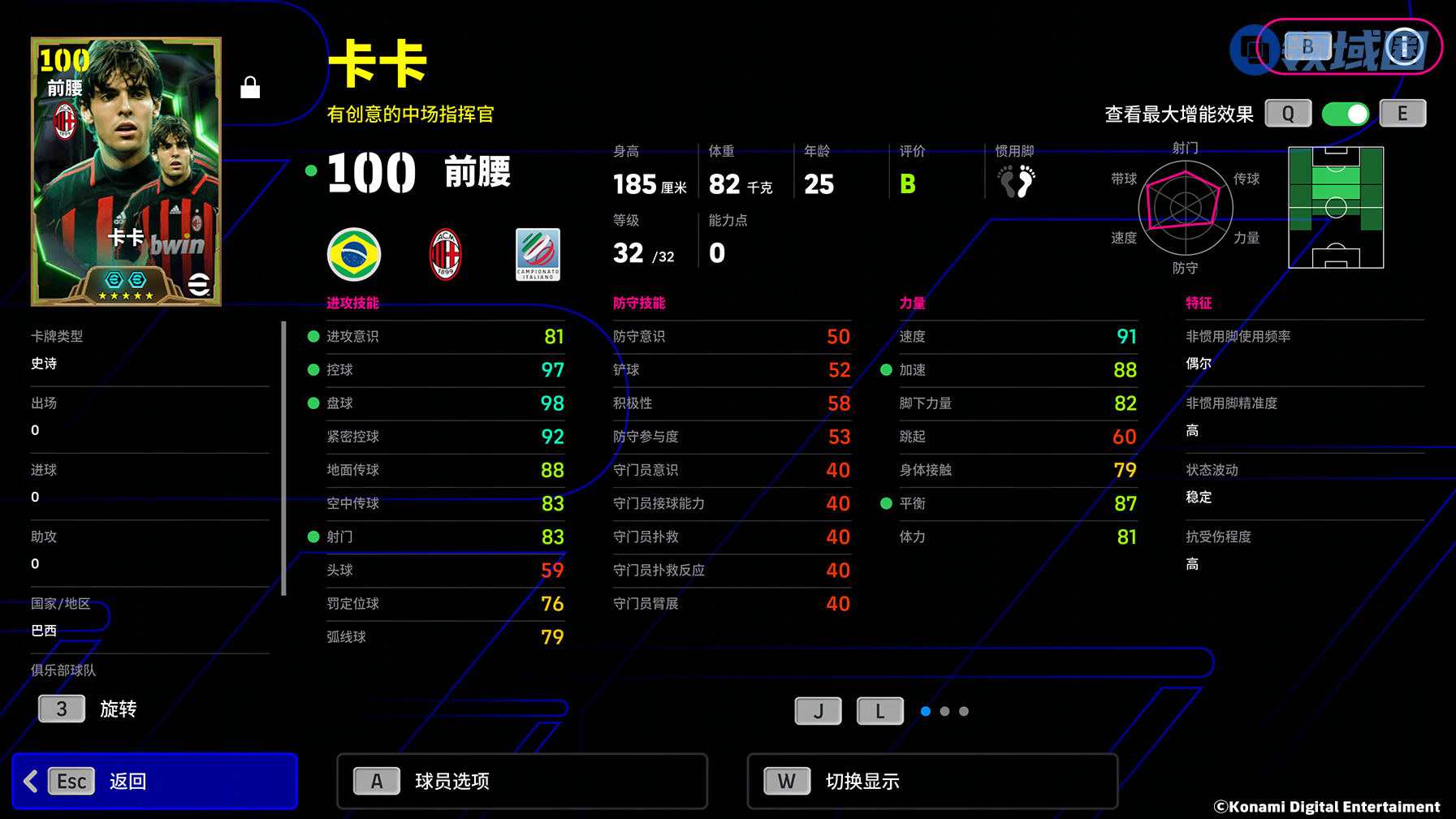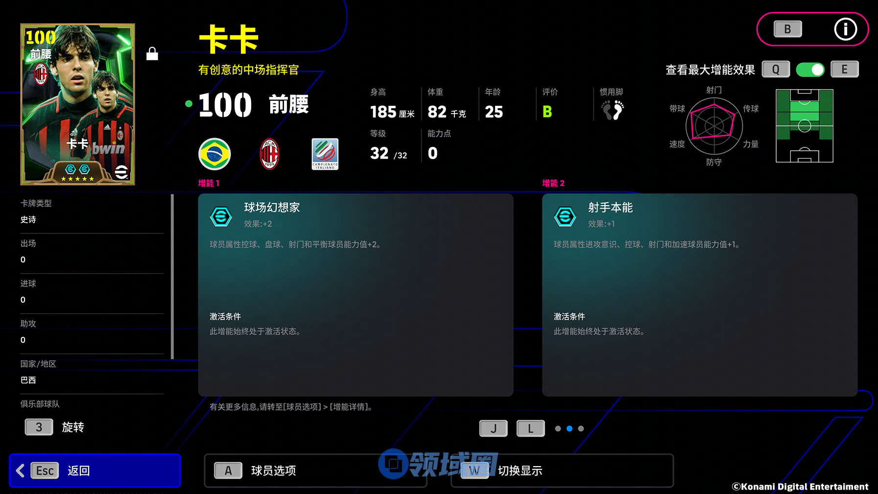 卡卡拥有【球场幻想家 +2】的增能属性,控球、盘球数值的提升让他的每一次触球都步伐轻盈,飒沓流星!