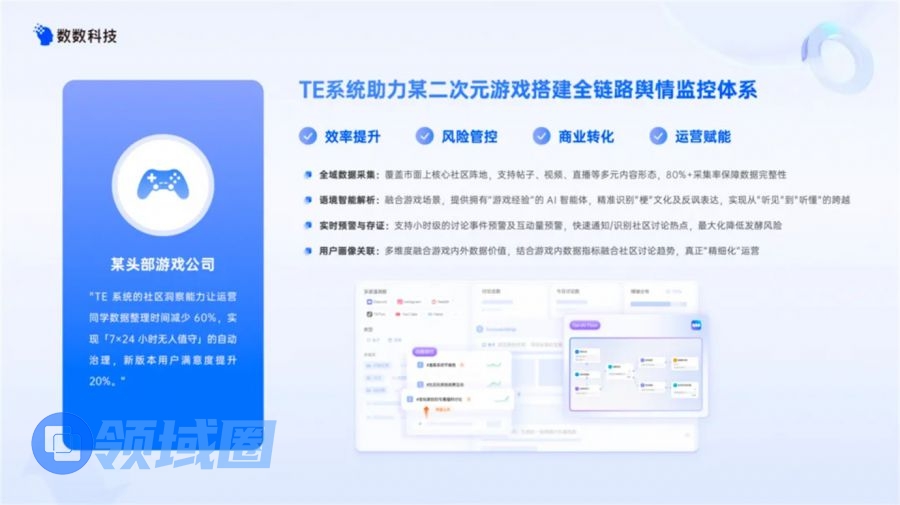 目前,TE 系统的社区洞察能力已经成功应用于游戏企业实际业务场景。通过 TE 系统的社区洞察能力,游戏企业不仅能对玩家社区进行全景监控,还能将社区讨论中的情绪、热点与游戏内的用户画像深度关联,从而为版本更新、活动设计甚至剧情走向提供数据驱动的决策支持。