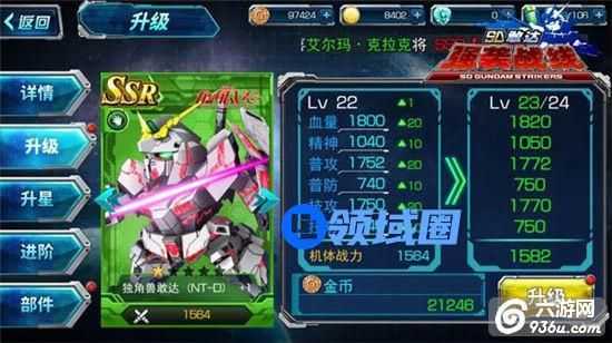 【机体升级—在战斗中不断成长】 《SD敢达强袭战线》的强化系统主要是针对机体的强化。机体的可以消耗金币升级到与指挥官等级相同的级别,每升高一级,机体的六维数据就会有所提高,这是强化系统里面最基础的强化,要想尽快提高部队的战力,那就去多多战斗,完成日常任务,尽快获得经验提高指挥官等级。 【升星进化—成为战力拔群的“五星上将”】 升星可以大幅度提升机体的战力。玩家收集某一已拥有机体的机体碎片达到一定数…- 171