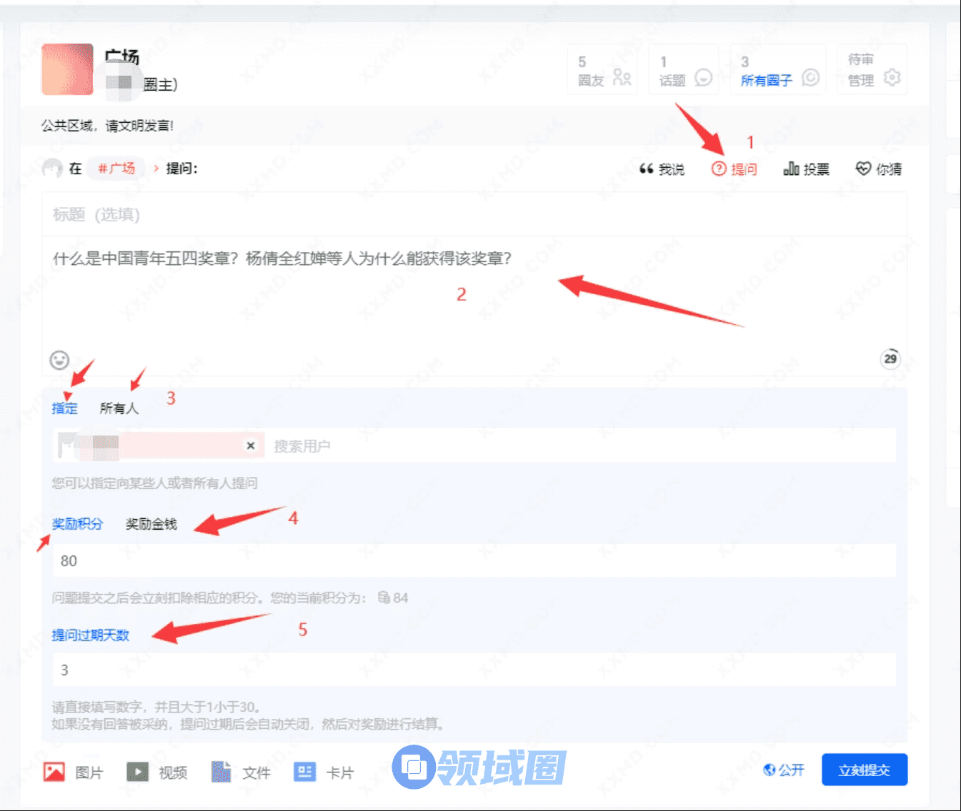 您可以向指定用户提问或向全体用户提问,可选择使用积分或金钱作为回答问题的奖励,支持设置问题到期时间。